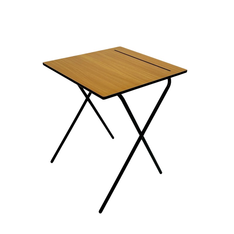 Built to our specifications these tables have a 1.5 cm thick laminated MDF wooden top, complete with groove for pens and stylish black metal folding legs. We have tested these products for 20 plus years now with our sister company, BE Event Hire who have 100’s of these desks in hire stock and they last for years. With a strong robust top and folding legs, these desks allow you to create an instant exam style event space yet when not in use they stack neatly and take up very little space.