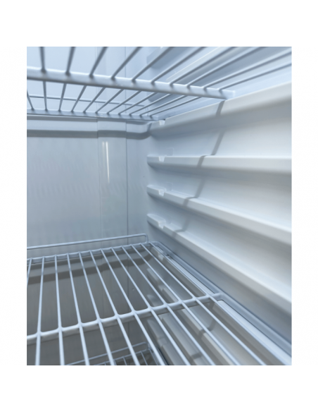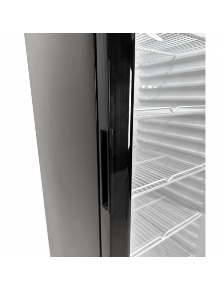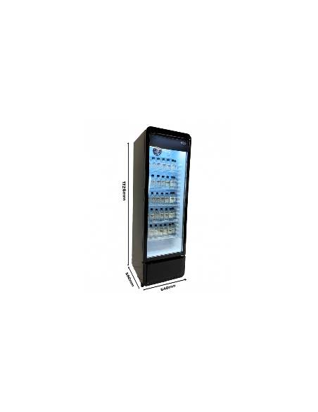 This black glass door refrigerator is the perfect solution for any hospitality business, as well as semi-professional or home use. Its sleek black design makes it not only a functional appliance but also a modern eye-catcher in your space. The ventilated cooling system ensures your products are evenly cooled, keeping them at the perfect temperature. The efficient LED lighting brightly and energy-efficiently illuminates the contents. The adjustable shelves allow you to customize the space to suit your products' sizes. The dimensions are 540x560x1725 mm (LxDxH) - power consumption 0.24 kW - capacity 280 liters - temperature +1/+10ºC - weight 47 kg.