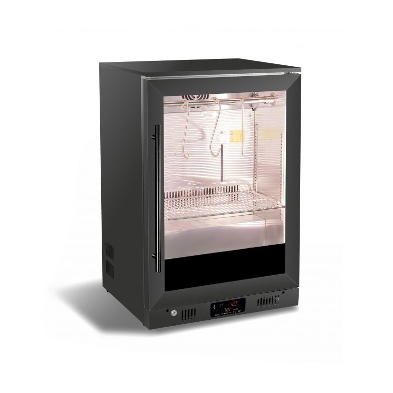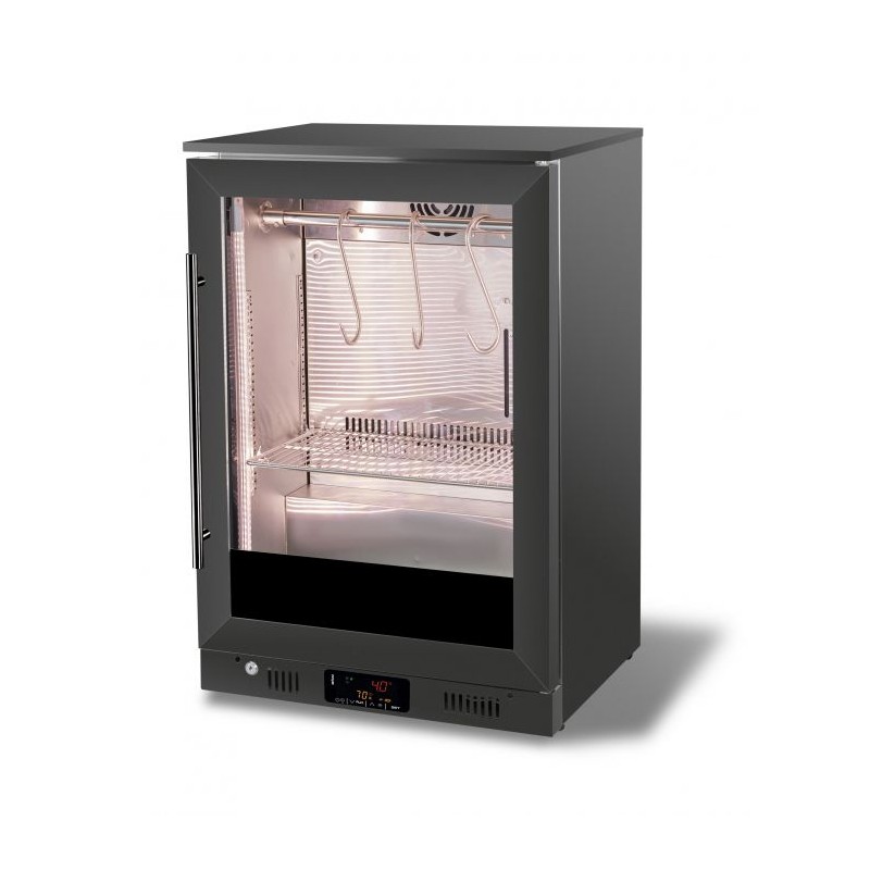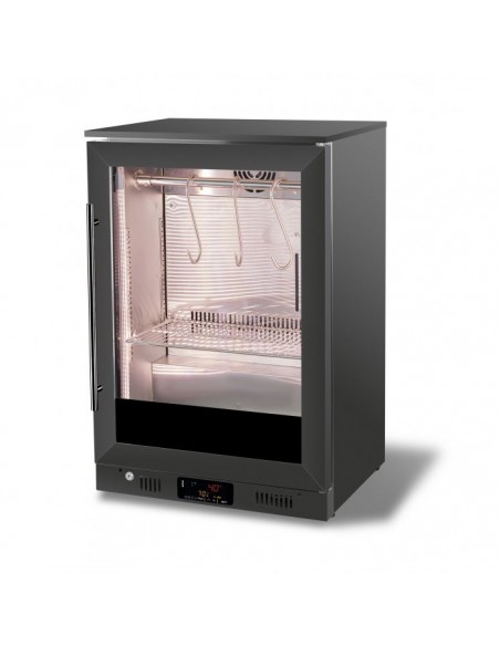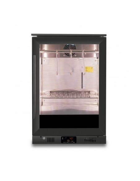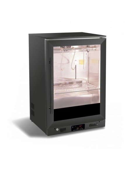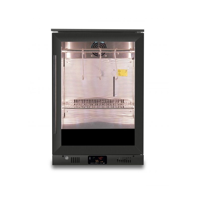 This stylish black dry age cabinet offers the ideal temperature and humidity for the dry aging process, with a glass door for excellent product presentation. The LED lighting ensures optimal illumination of your products. The user-friendly control panel allows precise temperature adjustments, while the forced cooling system maintains a stable environment. The humidity level of 65-85% creates perfect aging conditions. The modern, stylish black finish makes the cabinet a real eye-catcher in any professional setting.