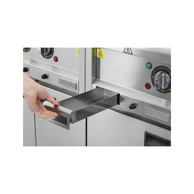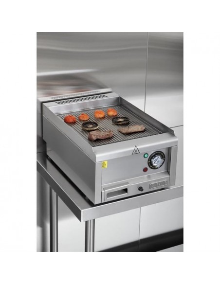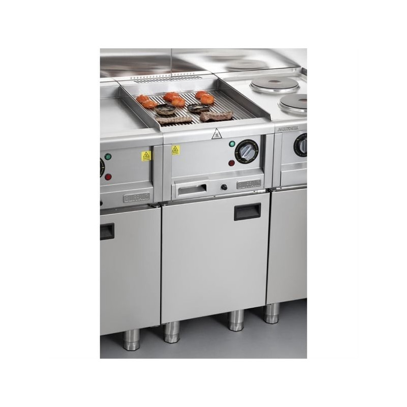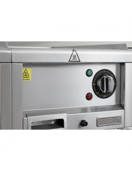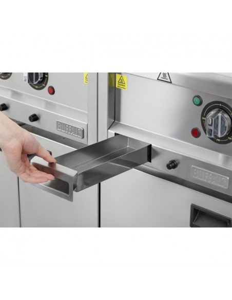 A 10mm thick mild steel ribbed plate and powerful 2.9kW element ensure fast heat-up times and even heat distribution across the entire surface - essential for consistent cooking results. The ribbed plate is ideal for cooking food with attractive branding lines, as well as channelling fat away into the large 1-litre capacity fat collection drawer.