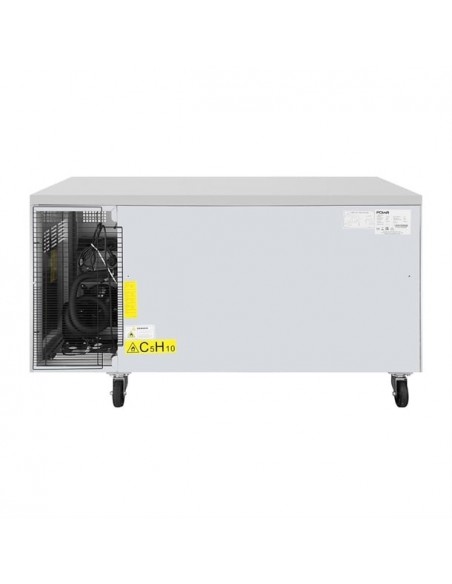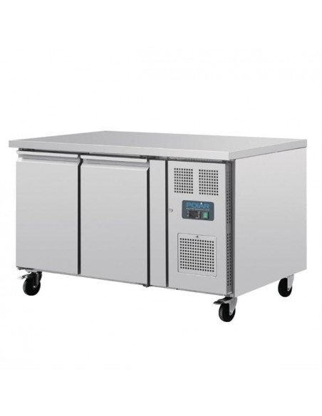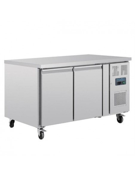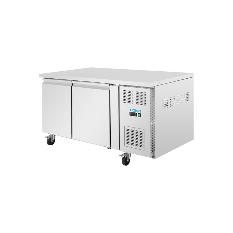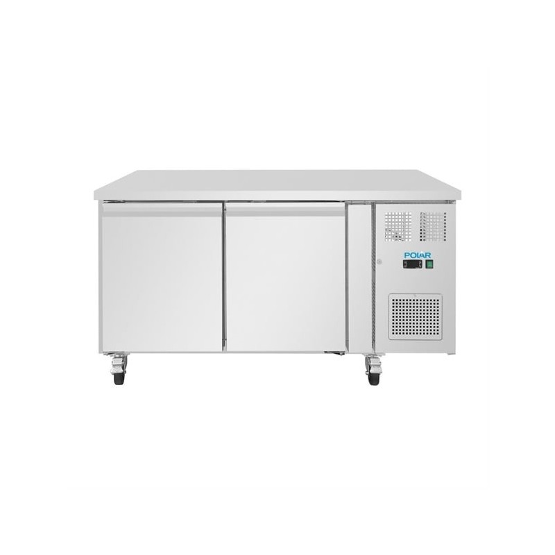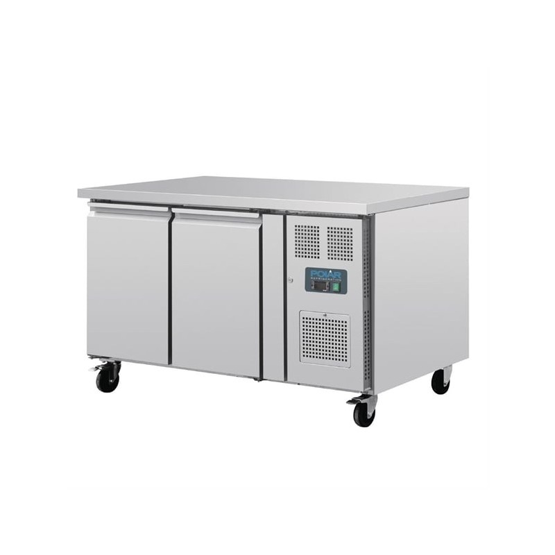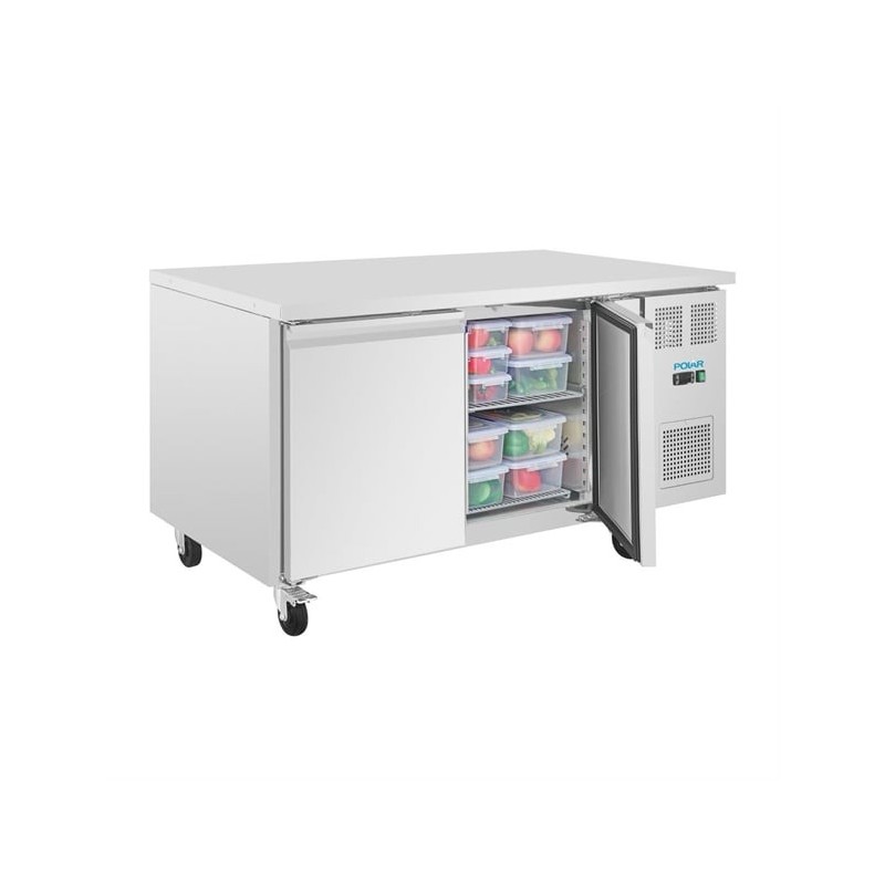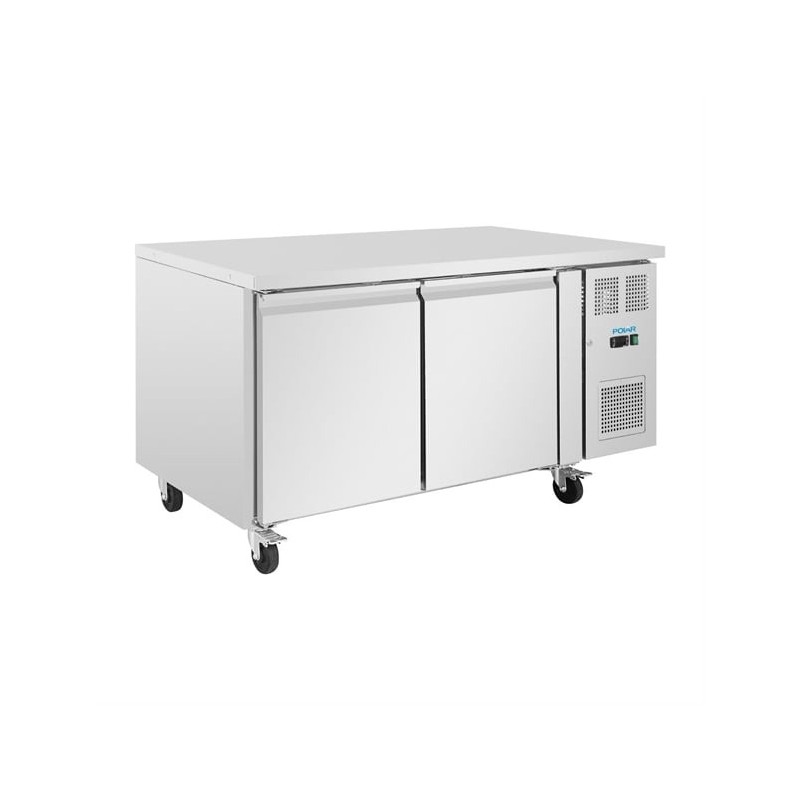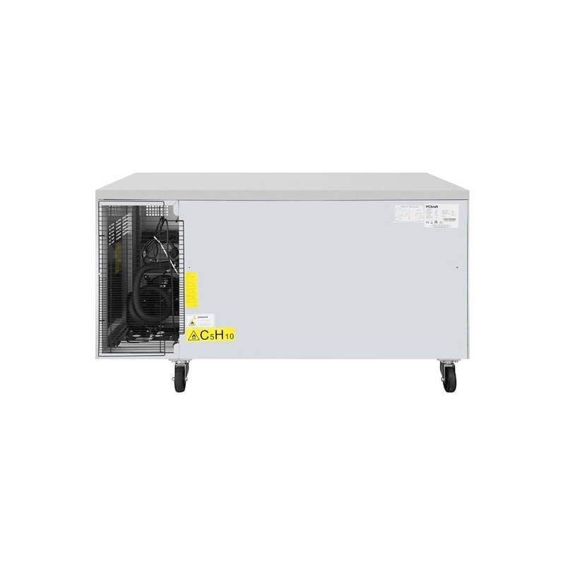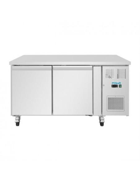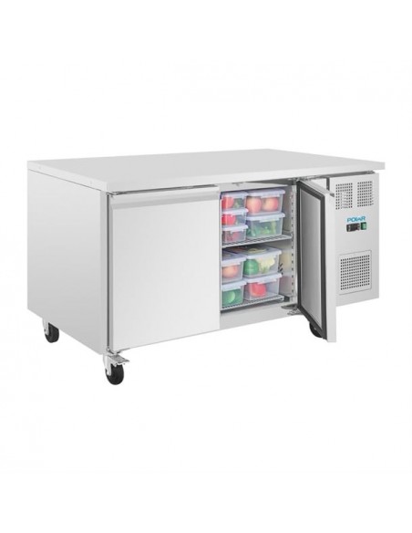 The Polar U-Series commercial counter fridge combines reliable refrigeration with a practical work surface, optimizing space in professional kitchens. Featuring automatic defrost and a constant digital display, it ensures precise temperature control. Equipped with lockable castors for easy mobility, the fridge is compatible with 600x400mm patisserie trays, supporting up to seven trays per door for ample storage.