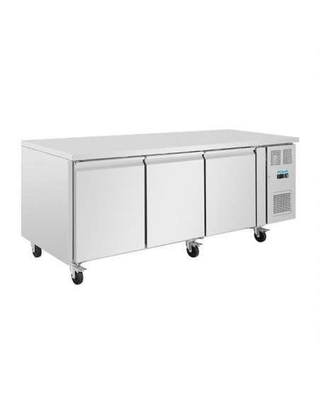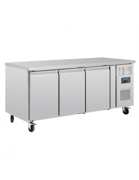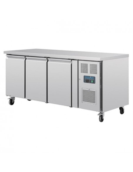 The Polar U-Series three door patisserie counter fridge offers a dependable and versatile solution for bakeries requiring high-capacity storage for chilled foods on bakery trays. Featuring robust construction and user-friendly digital controls, this fridge includes a space-saving worktop for added convenience. Automatic defrost enhances efficiency by minimizing downtime, while lockable castors allow for easy repositioning.
