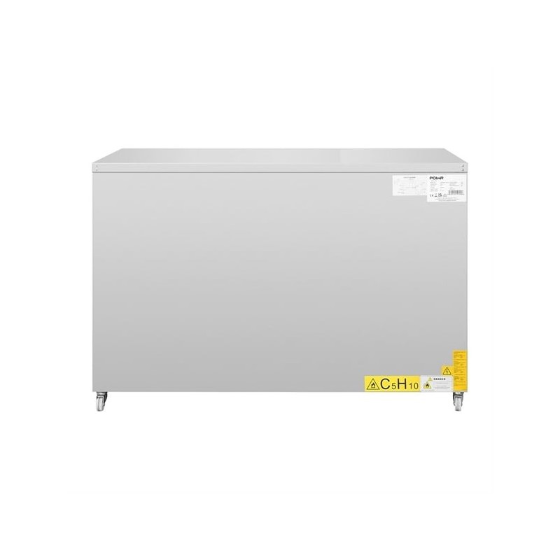 Boasting a spacious 400-litre capacity, the fridge features two shelves and two floor protectors for optimal organization. The stainless steel worktop provides additional versatility, while castors on the base make positioning and cleaning effortless. For added convenience, full-size gastronorm trays slide in easily without requiring extra runners.