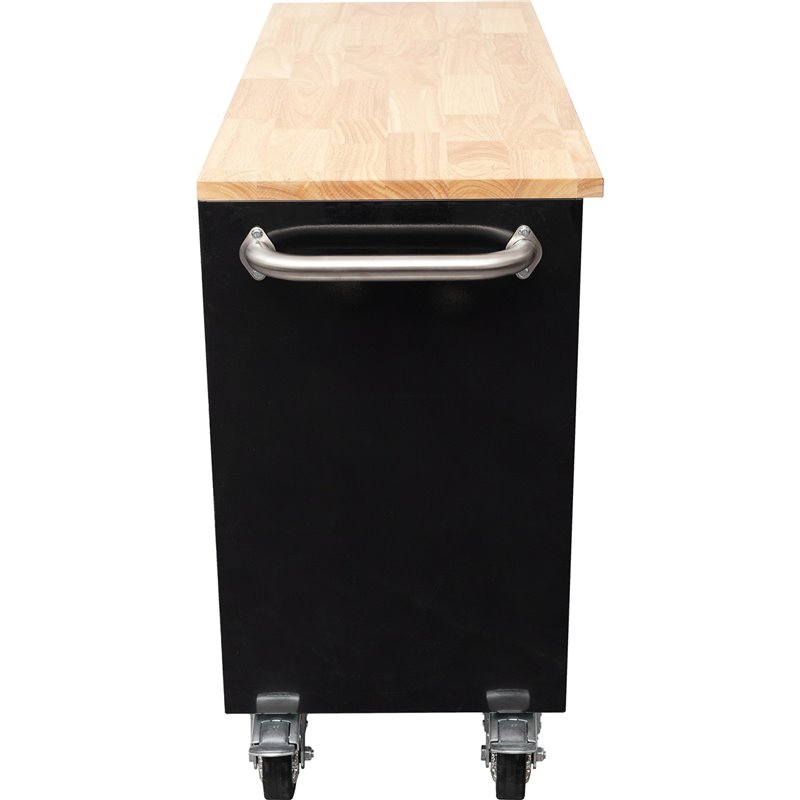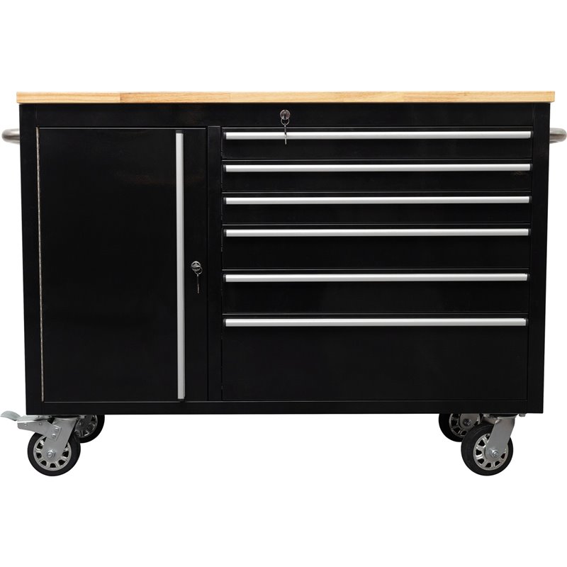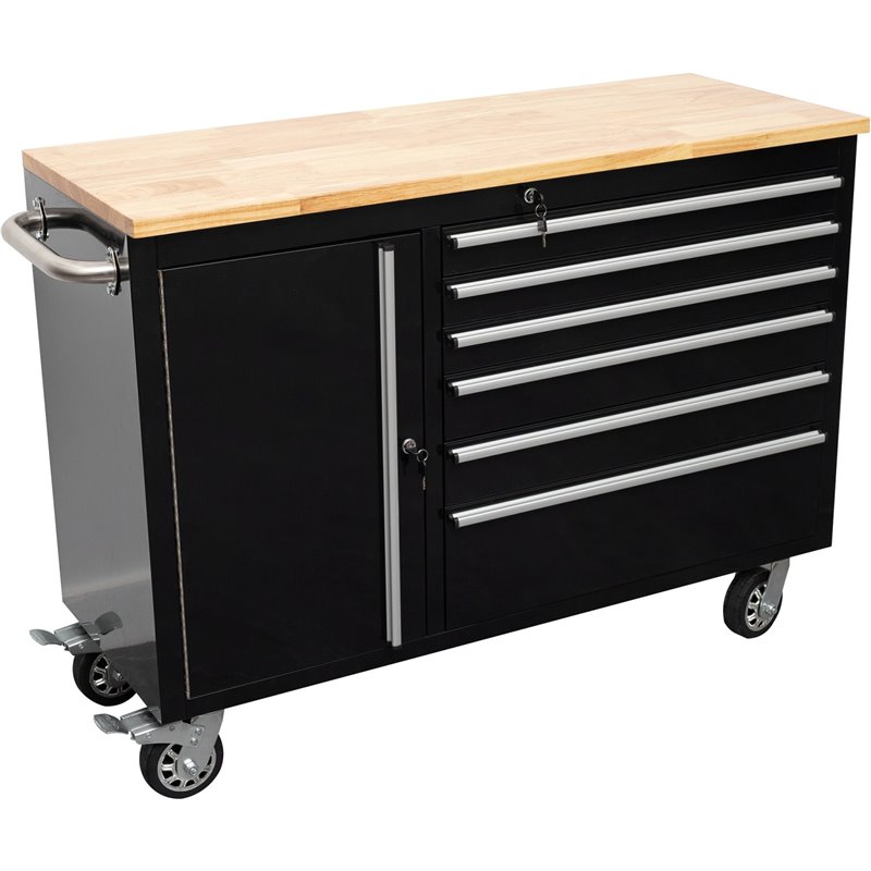 Heavy Duty Steel Rolling Tool Chest with Wooden Worktop 6 Drawers 1 Side Cabinet 1355x482x880mm Black | Stalwart DA-482038ABLACK