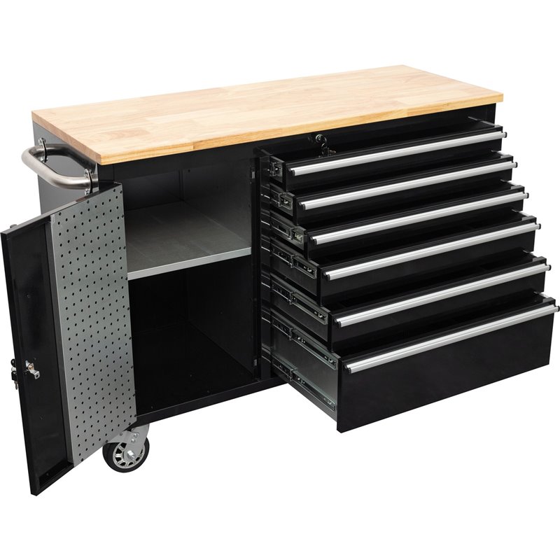 The Stalwart DA-482038ABLACK is a robust 48” steel rolling tool chest, ideal for workshops, garages, and industrial settings. Featuring a black powder-coated steel frame and a 25mm rubberwood worktop, it’s perfect for tool storage and light-duty tasks. Six lined ball bearing drawers (3x 690x396x59mm, 1x 690x396x88mm, 1x 690x396x192mm) organize tools efficiently, while a lockable side cabinet (389x439x697mm) with an internal pegboard stores larger items securely.