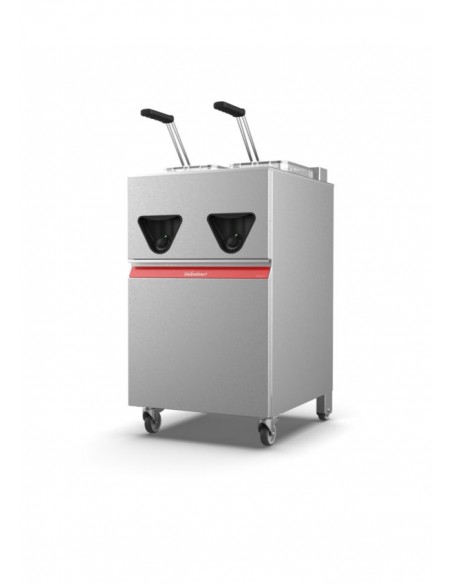 Heavy-duty turbo twin pan fryer. Output: 56-72kg. Dimensions: 500x600x850/900 mm. Power: 22kw. Amps: 32 amp.