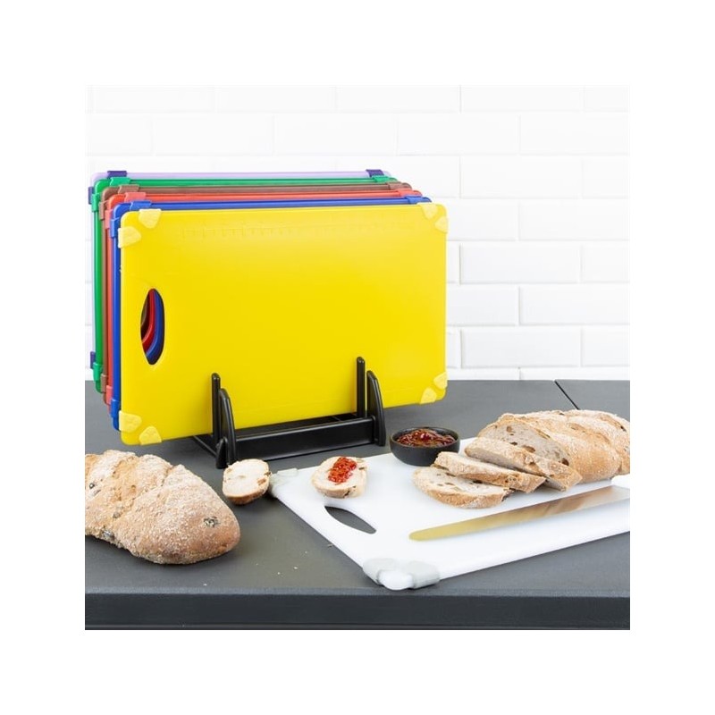 To minimize cross-contamination risks, the boards are colour-coded (purple, brown, green, red, blue, yellow, and white) to designate specific food types, aligning with HACCP-based Food Safety Management Systems. This intuitive colour system allows kitchen staff to quickly select the appropriate board, enhancing efficiency and hygiene in busy environments.