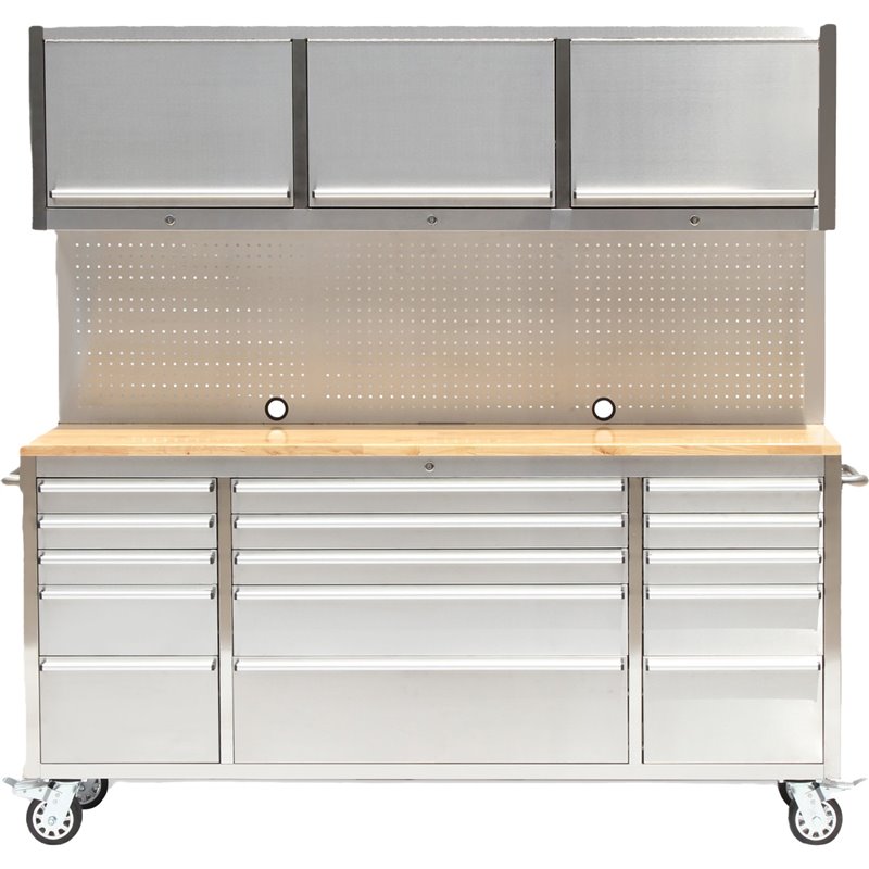 Heavy Duty Steel Rolling Tool Chest with Wooden Worktop 15 Drawers 3 Overhead Cabinets 1978x510x1828mm Stainless Steel | Stalwar