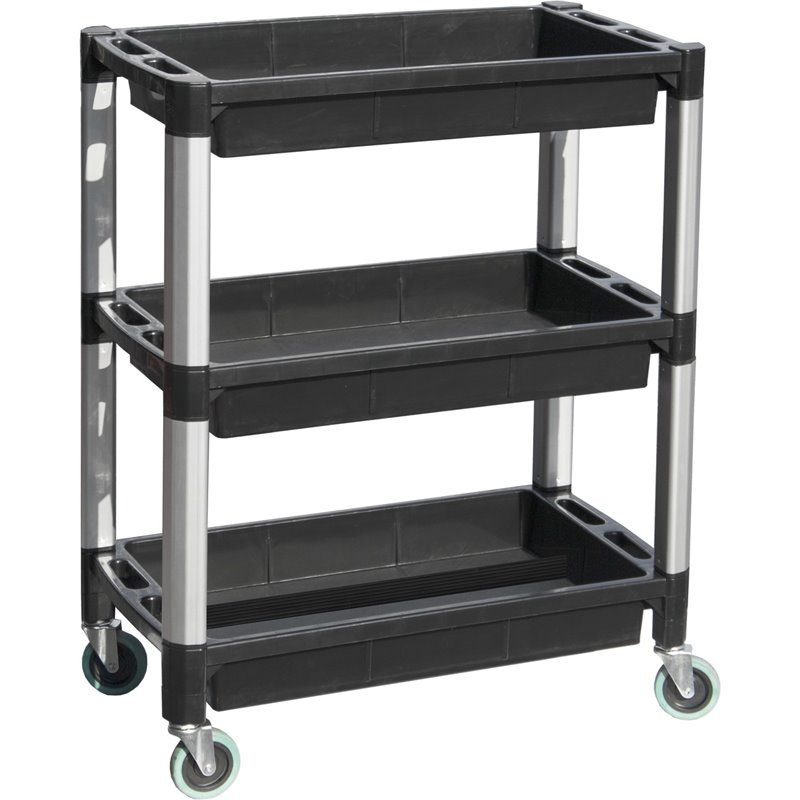 Professional Heavy Duty 3-Tier Plastic Utility Trolley with Raised Edge Trays & Steel Legs 136kg Capacity 760x410mm | Stalwar