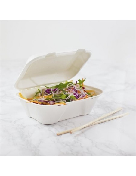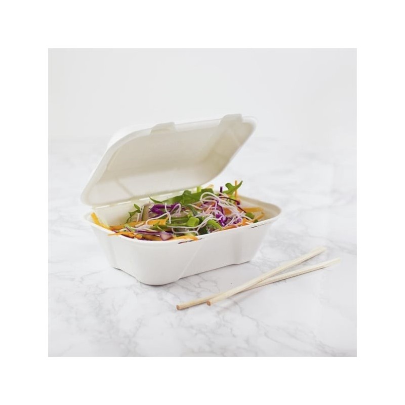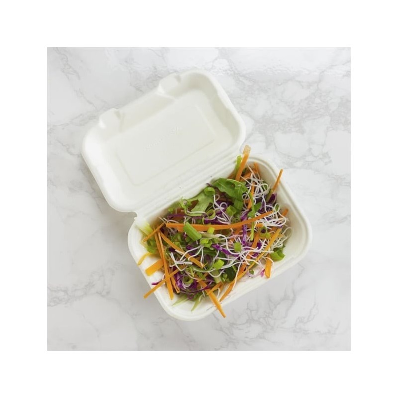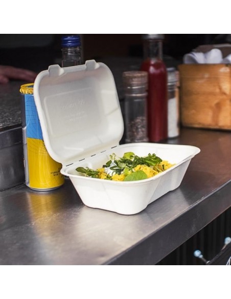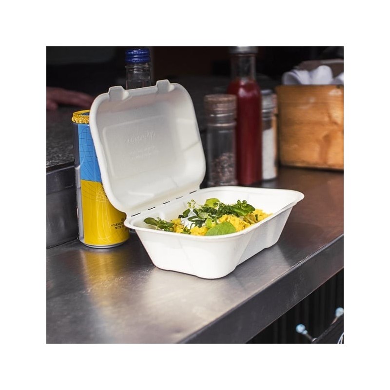 Bring a natural, eco-friendly touch to your food-to-go service with Vegware’s clamshell hinged meal boxes. Made from recycled, waste sugarcane (bagasse), these takeaway boxes are commercially compostable with food waste, helping you and your customers divert waste from landfills and transform it into nutrient-rich compost for plant growth.
