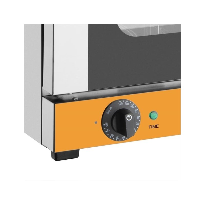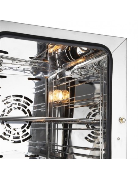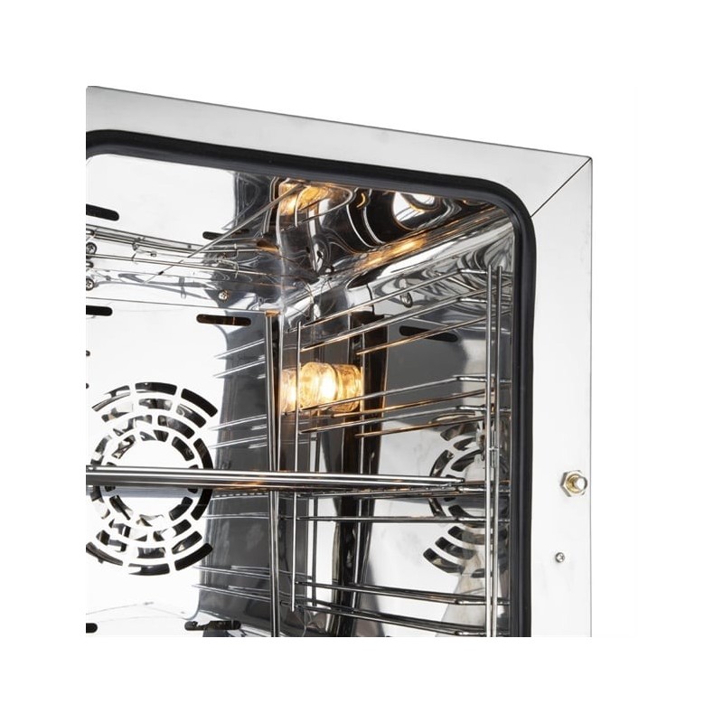 Powered by a 2.1kW electric convection system, the oven ensures fast, even cooking and consistent results across all trays – ideal for baking, roasting, and reheating. Its double tempered glass door allows you to monitor food without releasing heat, while the 430 stainless steel housing and interior guarantee strength, hygiene, and easy cleaning.