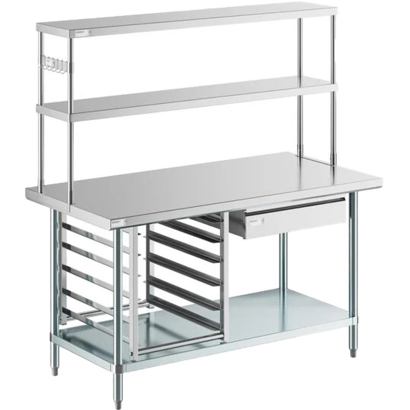 Ideal for commercial kitchens, bakeries, and catering environments, this heavy-duty stainless steel work table combines durability with smart storage solutions to enhance your workspace efficiency and organization.