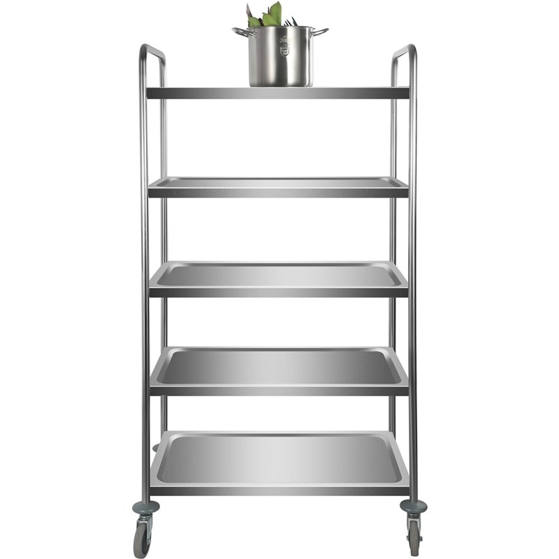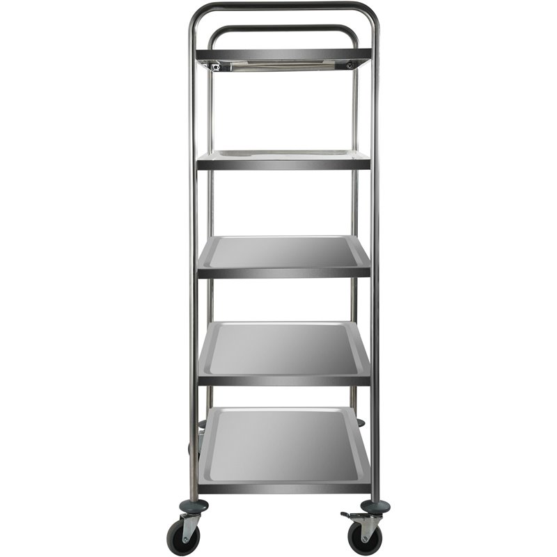 This sturdy 5-tier serving trolley, crafted from high-grade stainless steel, is perfect for kitchens, catering services, hospitals, and food service environments. Designed for heavy commercial use, it combines durability, hygiene, and functionality in a sleek, mobile unit.