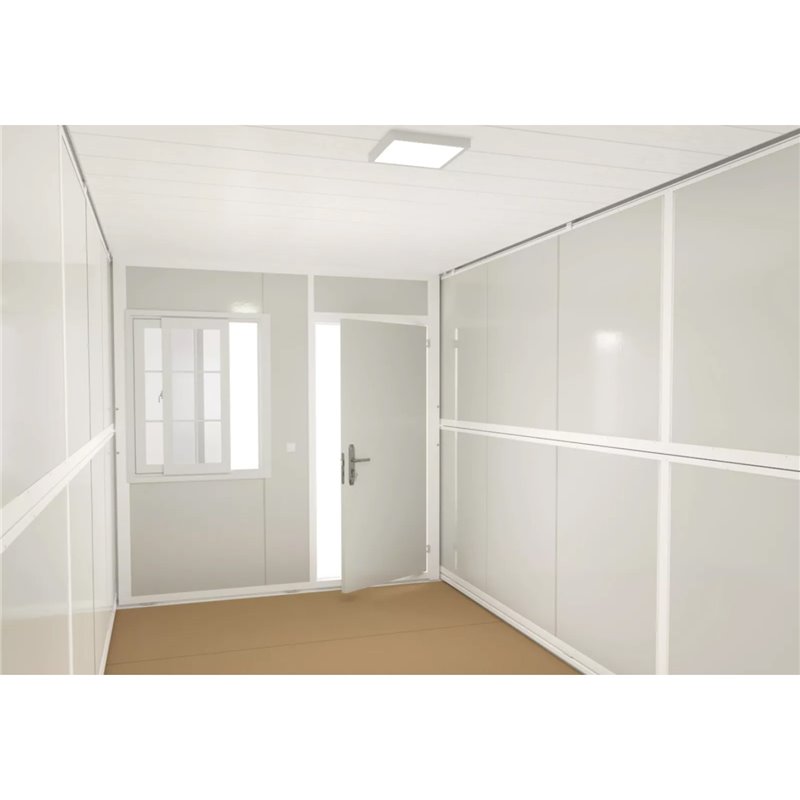 - Wall Panels: 0.28mm color steel plate + 50mm rock wool insulation (65kg/m³) Flooring: 15mm fireproof board with insulation (60kg/m³) Roof Material: 1040 color steel tile (0.45mm thick) Ceiling: 0.28mm ceiling tile with insulation Frame Material: High-stre