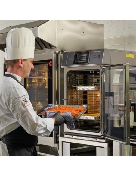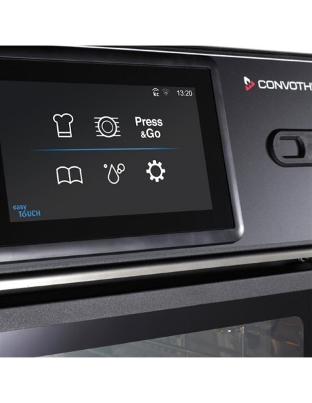 Despite its compact 51.5cm width, this oven handles up to six full-size trays, offering an impressive capacity-to-footprint ratio. It features a 7" high-resolution TFT touch display with the user-friendly easyTouch symbol-based interface, enabling intuitive operation even in high-pressure environments. The Press&Go automatic cooking system ensures consistent results using stored cooking profiles at the push of a button.