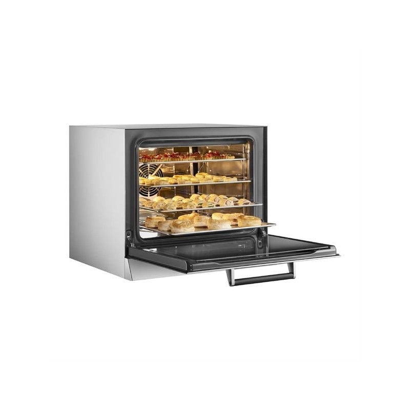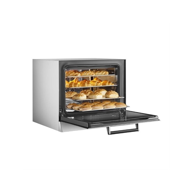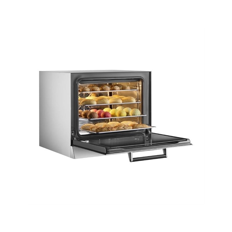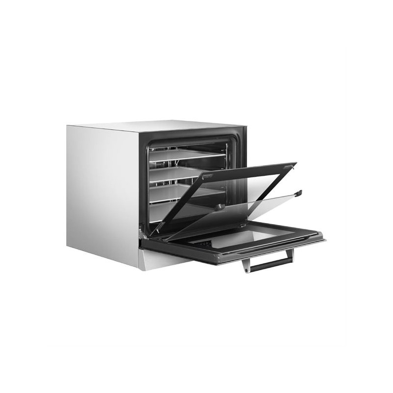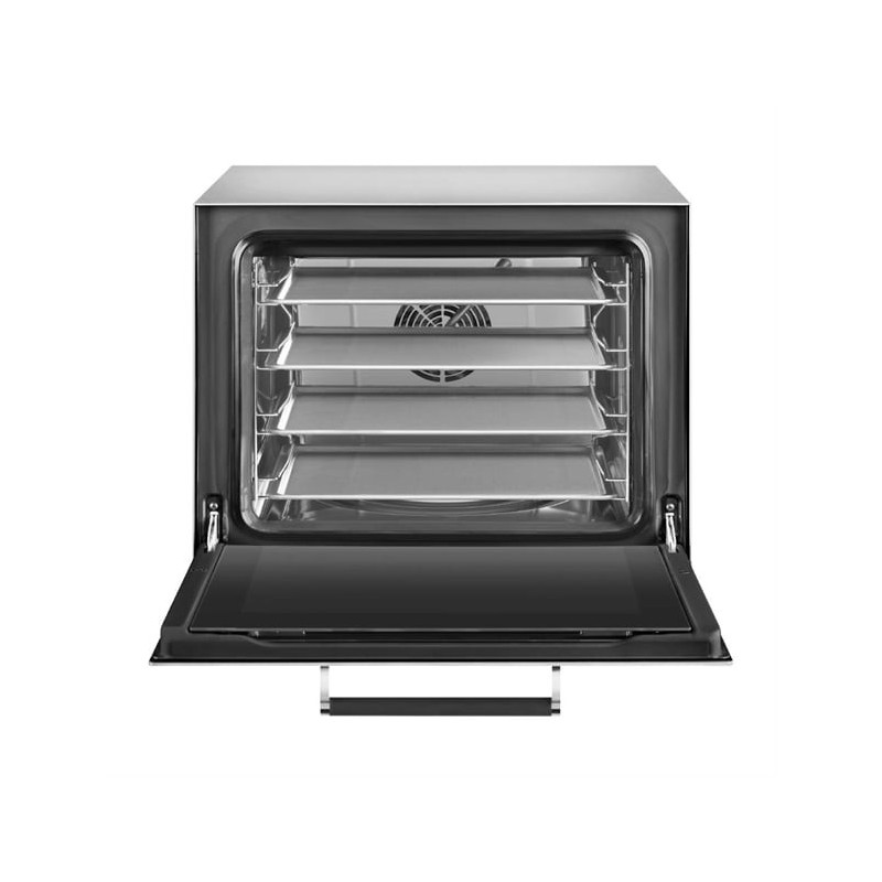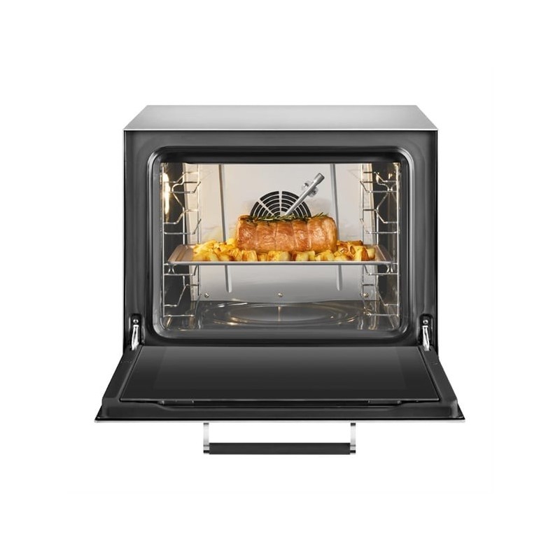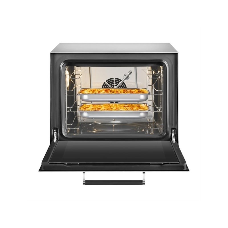 Featuring a fan-assisted convection system with dual-speed settings and an innovative humidification function, the oven creates the ideal environment for perfectly golden crusts or moisture-retaining bakes. The intuitive LCD display and 99 programmable two-step cooking modes allow chefs to maintain full control over time, temperature, and cooking phases – ensuring reliability and repeatability for every recipe.