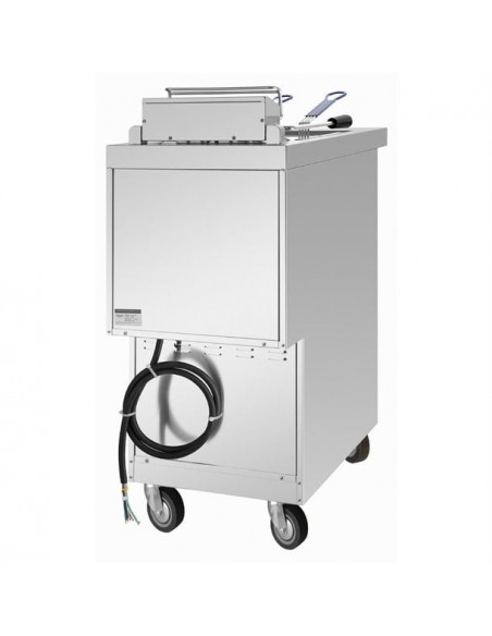 Equipped with twin baskets, the fryer offers excellent versatility, allowing you to prepare multiple dishes simultaneously. Its robust stainless steel construction, hinged elements, and oil drain tap with locking handle ensure easy cleaning and maintenance, while the castor wheels (two braked) make it simple to position wherever needed.