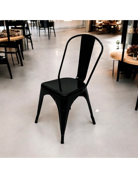 Brand new premium quality black metal Tolix chairs. To say the industrial style is popular is an understatement. Adored by patrons and proprietors alike, the simple design is versatile whilst contributing to the necessary durability, whether your customers are relaxed and easy-going or energetic and lively. Their design is one that takes the punishment of a ding here or a bang there without detracting or ruining the look.
