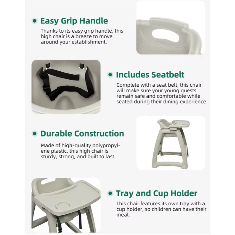 Ideal for use at home, in restaurants, cafeterias, or daycare centers, this versatile chair combines practicality with modern design. Its neutral gray color fits seamlessly into any environment while offering a long-lasting, safe solution for young children.