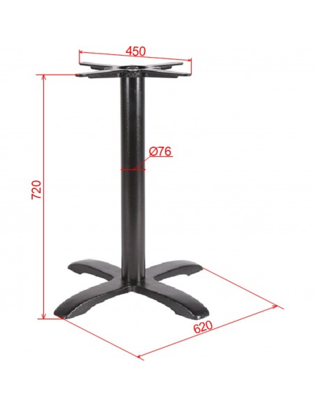 This heavy-duty black cast iron table base combines commercial-grade durability with a sleek, modern design, making it perfect for restaurants, cafés, pubs, and bistros. It features a robust 620 mm cross-style base that provides maximum stability and supports a wide range of tabletops. The sturdy Ø76 mm central column delivers solid structural support, while the 450 mm top plate ensures secure and easy mounting. With a standard height of 720 mm, this base is ideal for typical dining setups. Finished with a matte black powder coating, it offers a durable, long-lasting finish that complements any interior style.