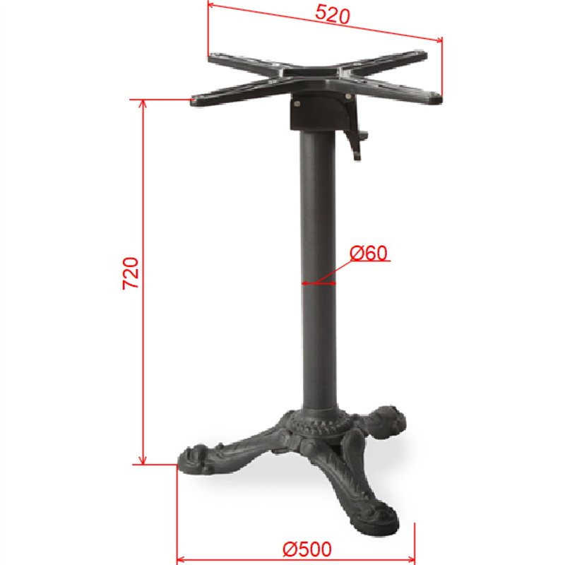 This heavy-duty black cast iron table base delivers strong support and a sleek, modern look, ideal for commercial dining environments such as restaurants, cafés, and bistros. The round 500 mm base with three elegantly curved legs ensures excellent stability while maintaining a compact footprint. Featuring a robust Ø60 mm central column, it provides reliable structural strength. The 520 mm top plate allows secure mounting for a wide range of tabletops. Finished with a durable black powder coating, this base combines functionality with lasting style at a standard dining height of 720 mm.