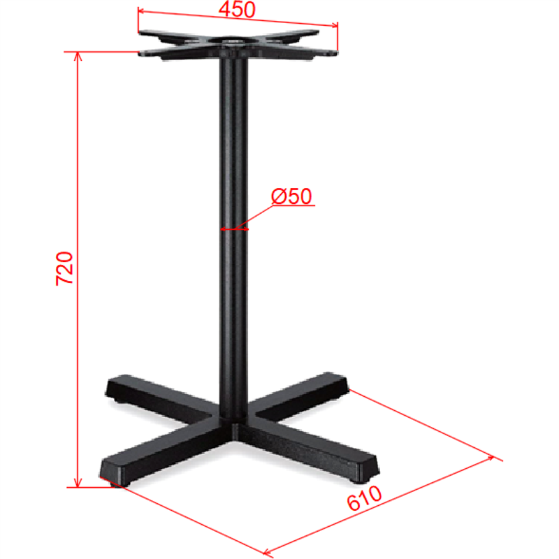 Engineered for commercial durability and sleek aesthetics, this heavy-duty black cast iron table base is the perfect choice for restaurants, cafés, pubs, and bistros. Its robust 610 mm cross-style base offers excellent balance and stability, supporting a wide variety of tabletop sizes. The strong Ø50 mm central column ensures dependable structural support, while the 450 mm top plate provides a secure and easy mounting platform. Standing at a standard dining height of 720 mm, this table base is finished in a matte black powder coat for a modern, wear-resistant appearance that complements any interior setting.