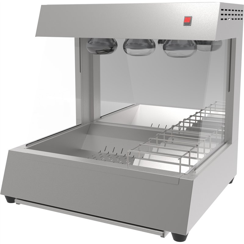 The robust stainless steel unit features a generous 631 × 522 × 100 mm chip tray, complemented by overhead heating lamps and a heated base for consistent warmth and texture.