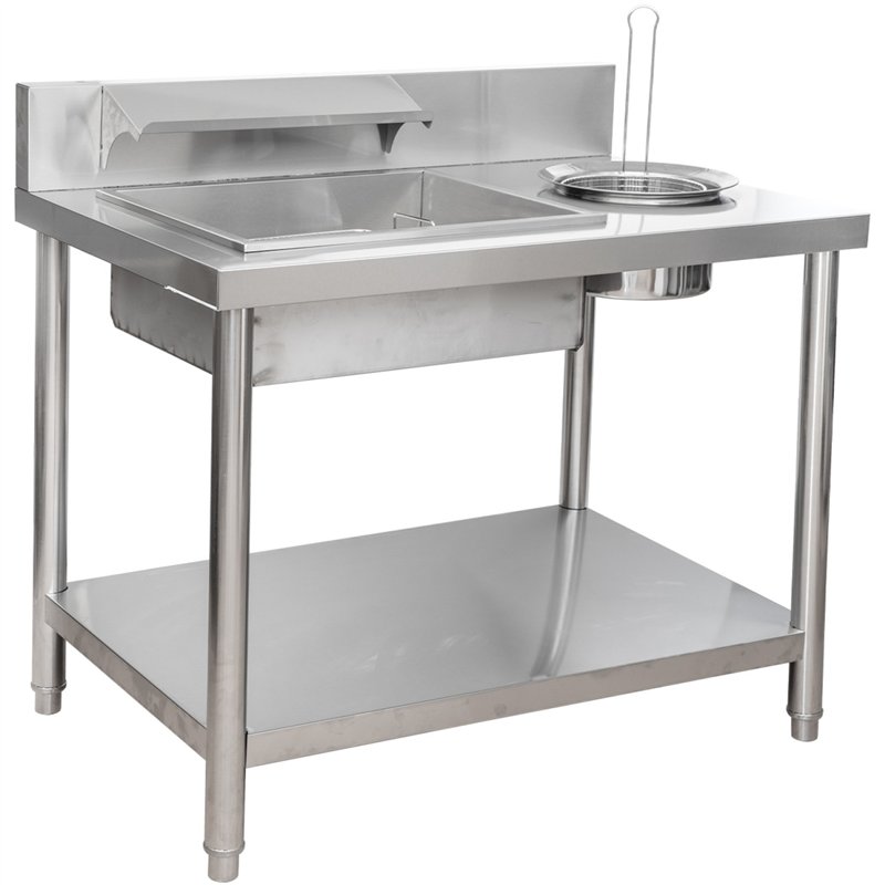 Designed for workflow optimization, the table comes with matching baskets for each basin, allowing you to maintain a clear separation between wet and dry stages. A rear splash guard helps contain mess during prep, while the undershelf offers handy storage space for trays, containers, or extra ingredients.