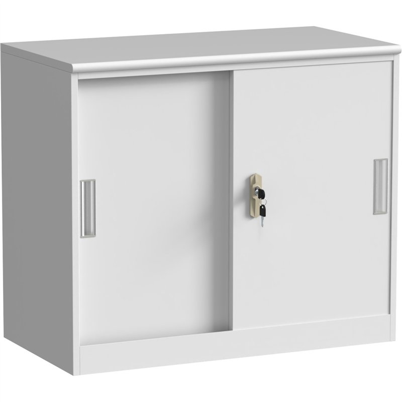 The cabinet features two lockable sliding metal doors with an adjustable internal shelf for flexible storage of documents and valuables. A sturdy MDF top provides a refined touch and additional workspace. Equipped with a reliable key lock system and sleek aluminium handles, this cabinet ensures secure storage while allowing easy access.