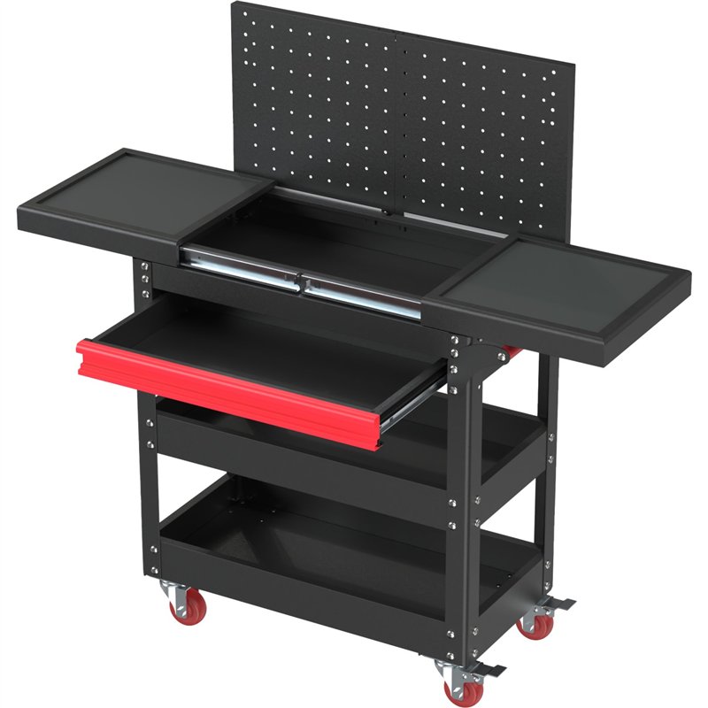 This cabinet features a spacious pegboard back for convenient tool hanging, a single wide drawer with a red handle for secure storage, and multiple open shelves for quick access to essentials. Two sliding top trays provide additional workspace and concealed storage. Heavy-duty swivel castor wheels with brakes allow easy movement and stability wherever you need a mobile workstation.