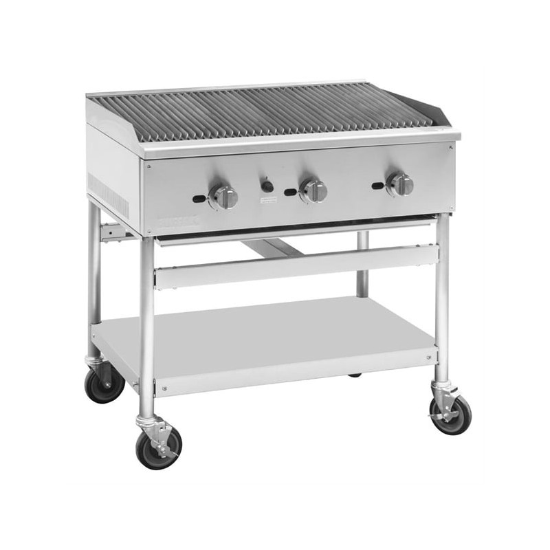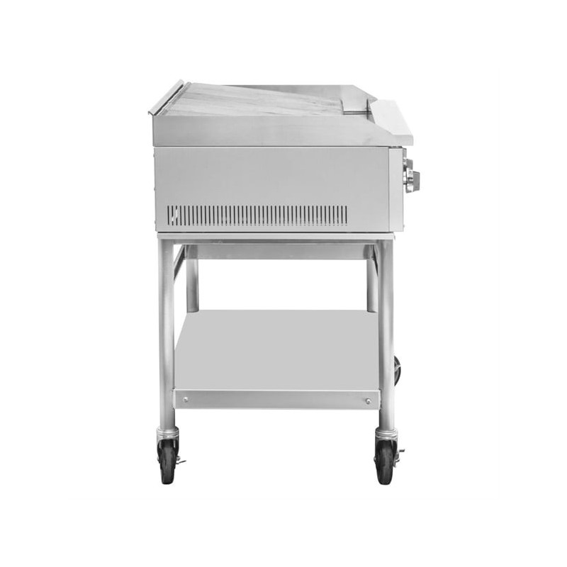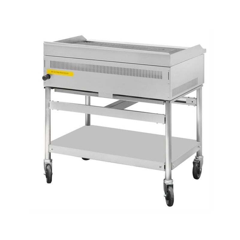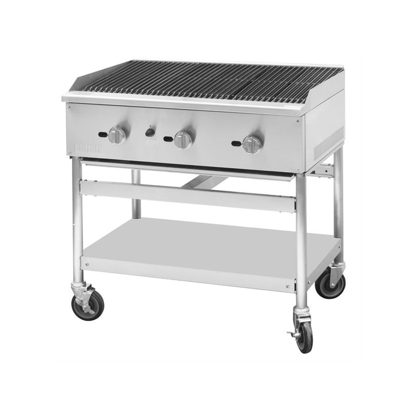 Designed for busy professional kitchens, the Buffalo chargrill is mounted on a sturdy stand with lockable castors, offering both stability during use and mobility when needed. Durable stainless steel splash guards to the sides and back help protect surrounding surfaces, ensuring a cleaner and safer cooking environment.