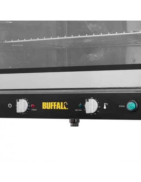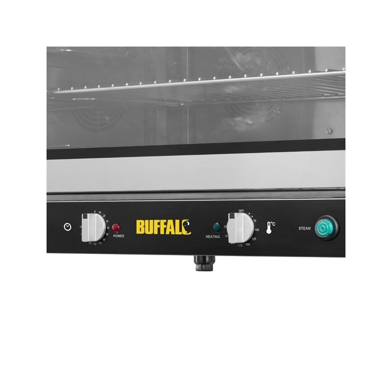 For convenience, the humidity function uses an integrated water pan, so no mains water connection is required. Built with a double-insulated design for energy efficiency, along with reinforced door hinges and overheat protection, this Buffalo convection oven is durable, safe, and designed for heavy-duty commercial use.