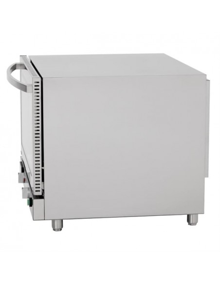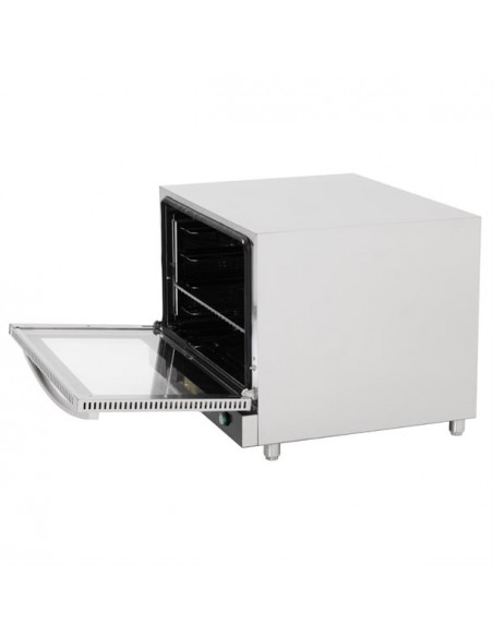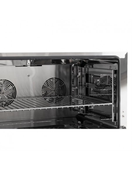 For convenience, the humidity function uses an integrated water pan, requiring no mains water connection. The oven’s double-insulated design improves energy efficiency, reinforced door hinges ensure durability, and overheat protection provides added safety. Its easy-clean stainless steel and glass construction make it practical for busy commercial environments.