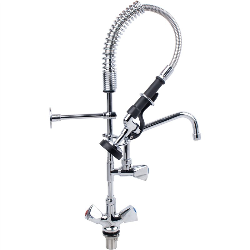 Engineered for efficiency and durability, this premium commercial pre-rinse faucet is the perfect multitasking solution for busy kitchens. Designed with a single-hole deck mount, it combines a polished chrome-plated brass body, a 12" riser for added clearance, and a 37" flexible stainless-steel hose with a heat-resistant handle for maximum reach and comfort. The high-efficiency 1.42 GPM spray valve delivers powerful cleaning at 60 PSI, while the integrated 8" swing nozzle allows quick pot filling and rinsing without switching stations. Ceramic cartridges ensure reliable, drip-free performance, and the adjustable wall bracket with overhead spring provides stability during heavy use.