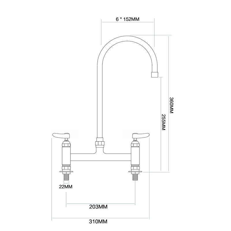 This heavy-duty 8" deck mount commercial faucet is built for professional kitchens and workspaces, combining durability, reliability, and functionality. Constructed from polished chrome-plated brass and equipped with durable compression cartridges, it delivers long-lasting performance. The 6" swivel gooseneck spout provides smooth water flow and excellent clearance, allowing flexible reach and easy cleaning. Dual lever handles offer precise control of hot and cold water, while the 8" (203 mm) center spacing ensures a straightforward installation.
