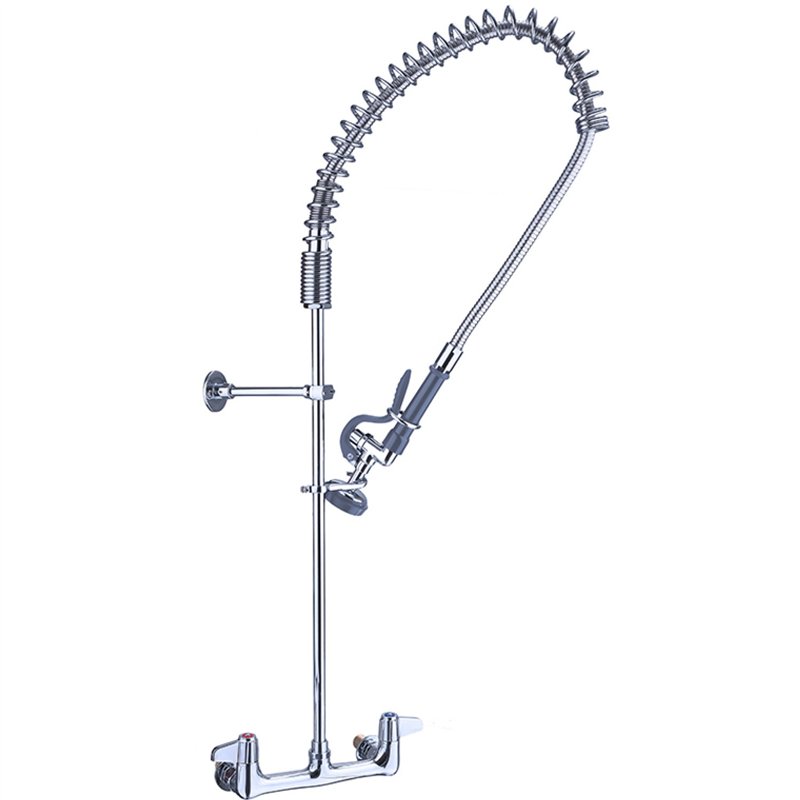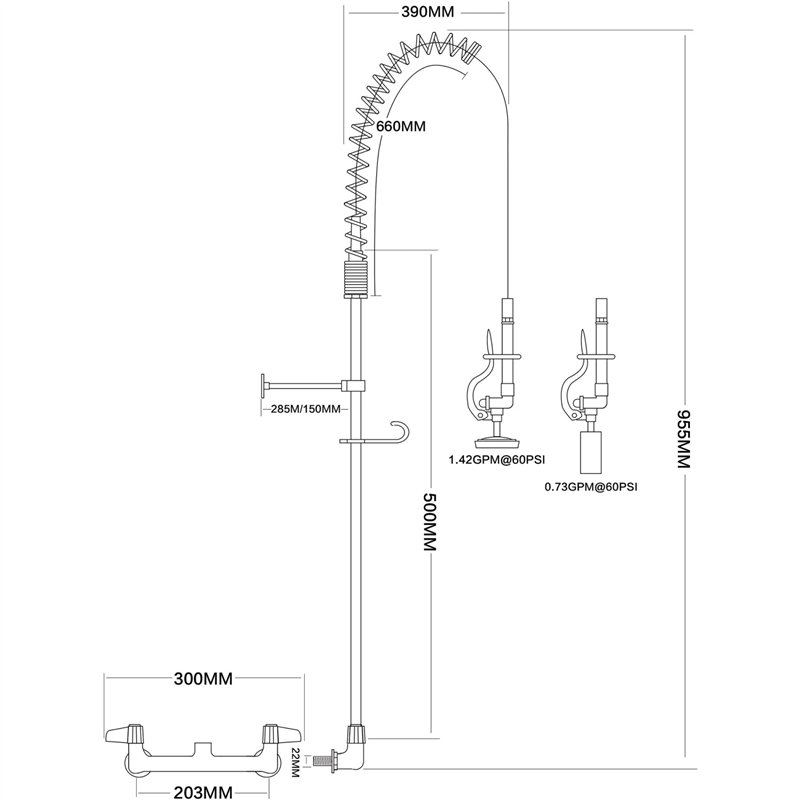 Designed for heavy-duty use in commercial kitchens, restaurants, and catering facilities, this professional 8" wall mount mixing faucet delivers durability, efficiency, and ease of use. Built from polished chrome-plated brass, it features a 20" riser and a 37" flexible stainless steel hose for extended reach and convenience. The heat-resistant ergonomic handle, high-efficiency 1.42 GPM spray valve, and ceramic cartridges ensure smooth, drip-free operation, water efficiency, and long-lasting performance. With standard 8" (203mm) hole spacing and 22mm dual inlets, installation is quick and reliable, making it ideal for demanding commercial kitchen environments.