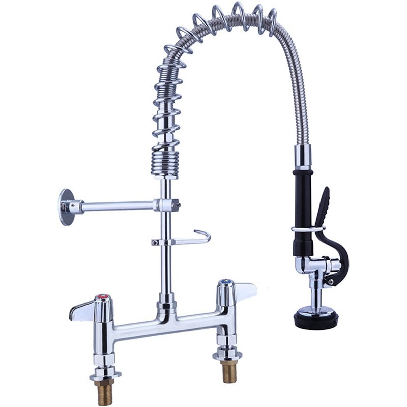 This commercial-grade 8" deck mount mixing faucet is engineered for durability, flexibility, and high-performance operation in busy kitchens. Featuring a polished chrome-plated brass body, an 8" riser with wall bracket, and an 18" flexible stainless steel hose, it provides maximum reach and control. The heat-resistant spray handle ensures safe, comfortable use, while the 1.42 GPM spray valve and ceramic cartridges deliver reliable, drip-free performance.