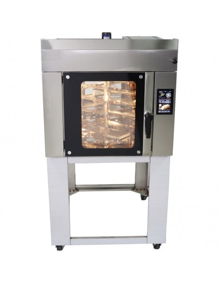 Equipped with a touch control panel, integrated steam function, and internal lighting, the oven allows precise temperature management up to 300°C, delivering consistent and efficient results. Its compact yet powerful design accommodates 5 trays (40×60 cm each) and includes a free 5-tray extended trolley with pans, offering added convenience for busy kitchen operations.