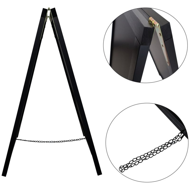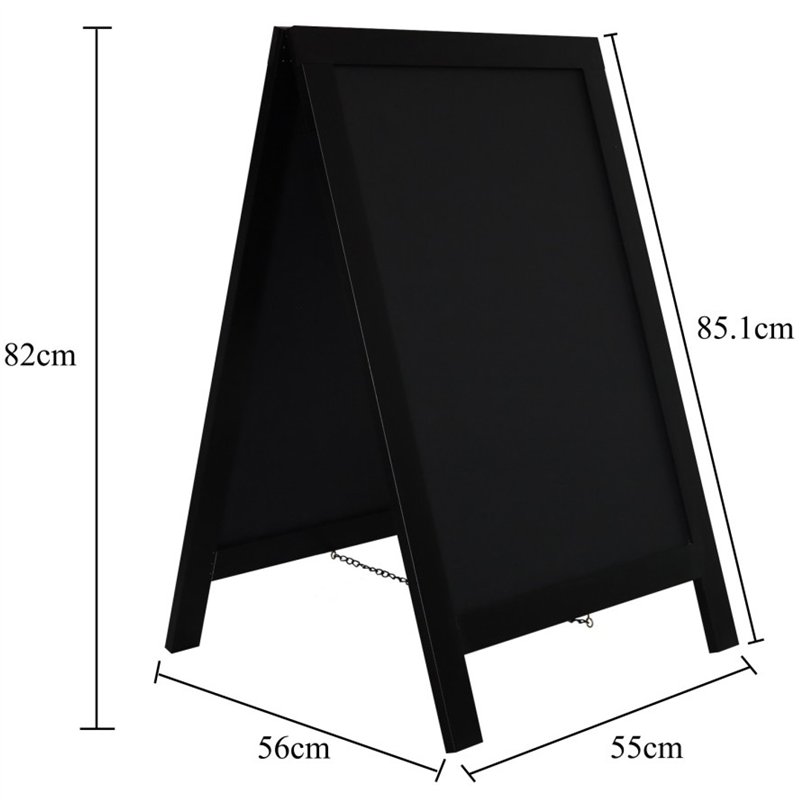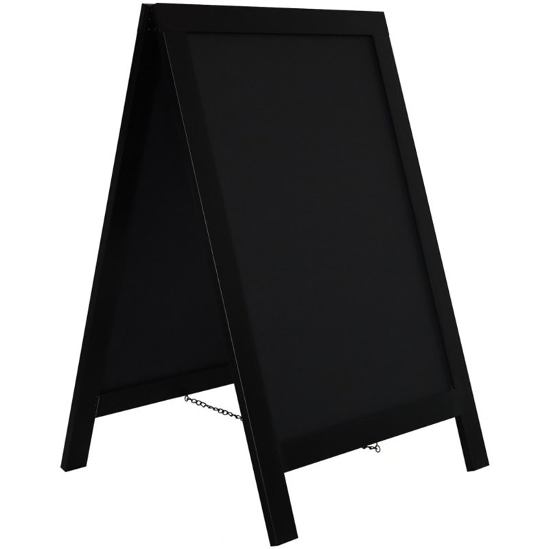 Highlight your daily specials, promotions, or messages with this freestanding double-sided pavement chalkboard, featuring a sturdy black wooden frame and a smooth black writing surface for a sleek, professional appearance. Its A-board design maximizes visibility, making it ideal for cafés, bars, restaurants, shops, and events.