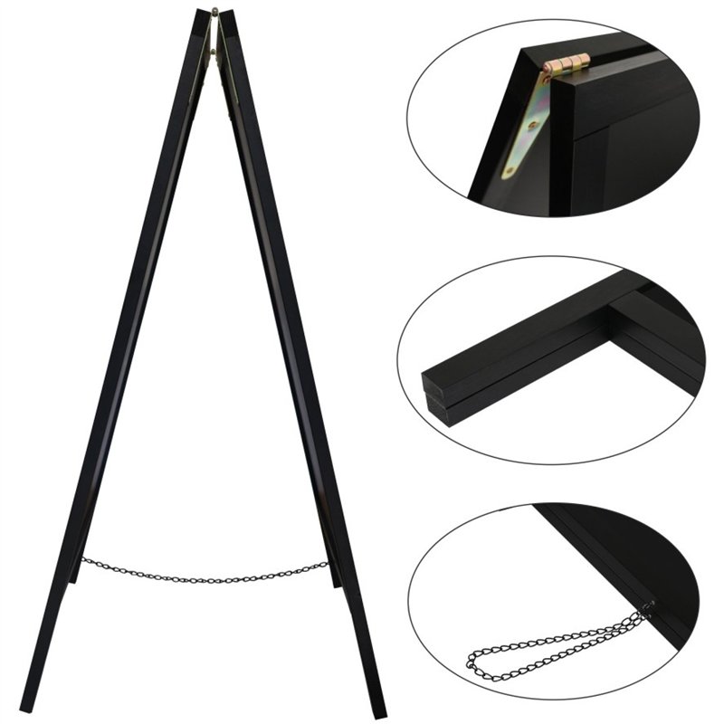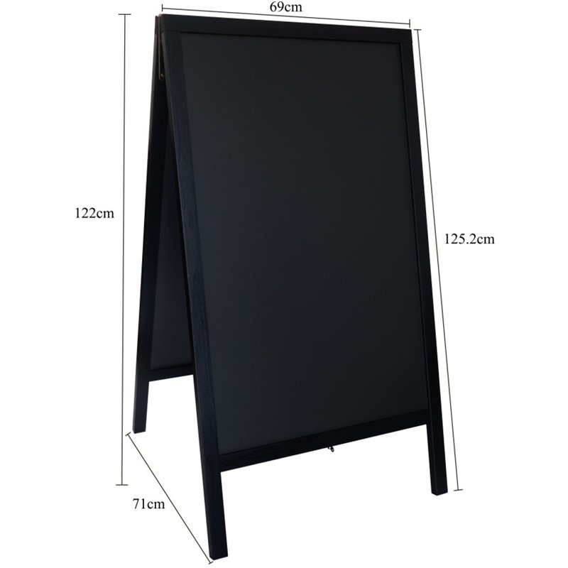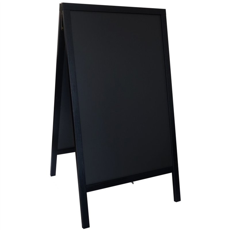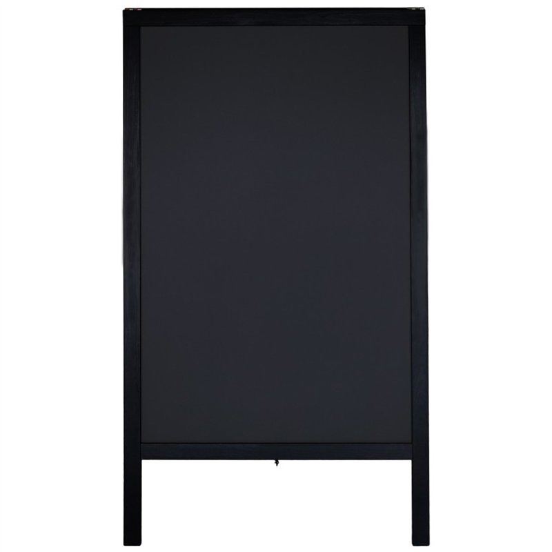 Showcase your daily specials, promotions, or important messages with this freestanding double-sided pavement chalkboard, designed to deliver both style and functionality. Crafted with a sturdy black wooden frame and a smooth black writing surface, it provides a professional look that enhances any café, restaurant, bar, or retail setting.