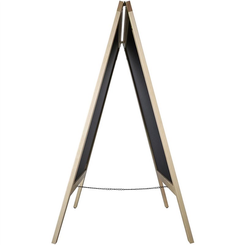 Enhance your café, bar, or shopfront with this elegant freestanding pavement chalkboard. Featuring a sturdy natural wooden frame and a smooth black writing surface, it is perfect for displaying daily specials, promotions, or messages. The double-sided design maximises visibility, while the foldable structure with chain support ensures stability and convenient storage. Ideal for both indoor use and sheltered outdoor areas, this chalkboard combines style with functionality.