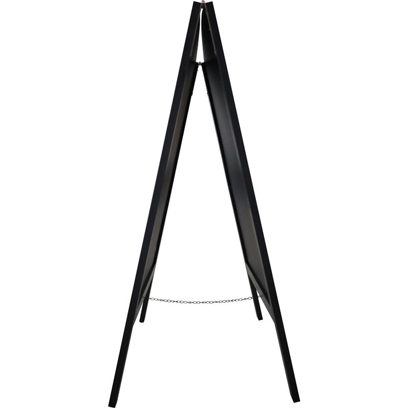 Add a stylish and functional display to your café, bar, or retail space with this freestanding pavement chalkboard. Featuring a sturdy black wooden frame with an elegant open-top arch, it delivers a distinctive and professional presentation. The smooth black writing surface is ideal for menus, offers, or announcements, while the double-sided design ensures visibility from both directions. Its foldable structure with chain support provides stability and easy storage, making it perfect for indoor use and sheltered outdoor areas.
