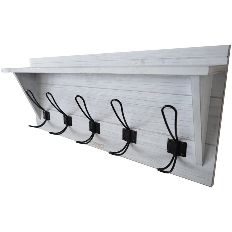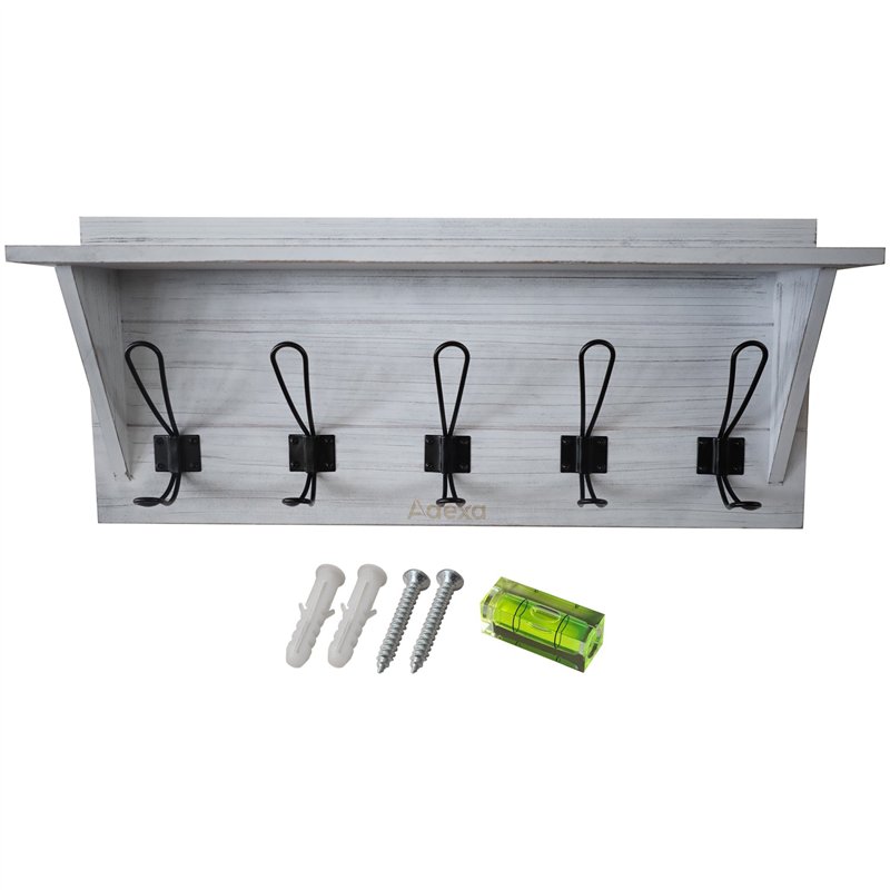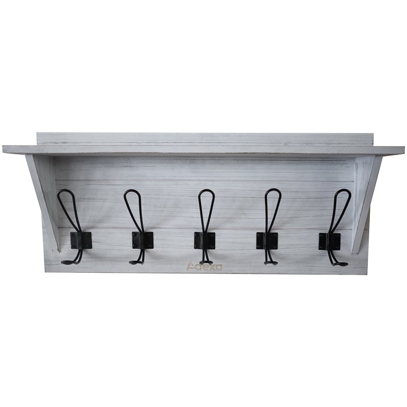 Rustic Wall Mounted 24" (610mm) Coat Rack Shelf with 5 Rustic Hooks Solid Pine Wood Whitewash | Stalwart DA-GWA320