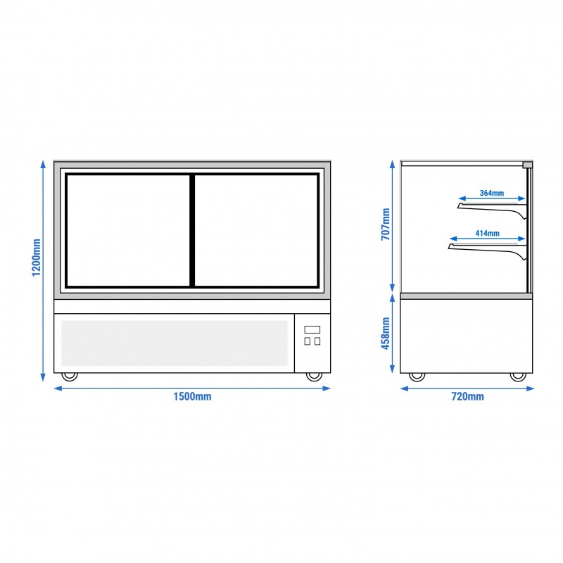 1500 mm (W) × 720 mm (D) × 1200 mm (H) – perfect for larger bakery counters or high-traffic environments. -