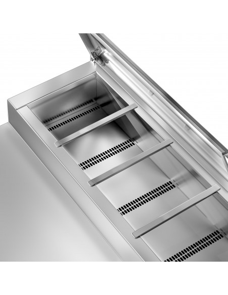 This high-performance commercial sandwich prep counter is the perfect solution for salad preparation, pizza making, and a wide range of other catering applications. Built to the highest industry standards, it offers exceptional durability, cooling efficiency, and convenience – a reliable addition to any busy professional kitchen, whether it’s a restaurant, takeaway, canteen, or café.