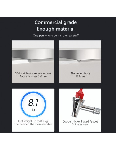 Built with a robust #304 stainless steel inner tank and a sleek black iron outer body, the WB10D combines durability with modern styling. The digital LED temperature display and adjustable thermostat allow precise control, ensuring the perfect water temperature for any service requirement. For added convenience, the unit includes a hose and built-in defrosting pan, making it easy to manage drainage and maintain optimal hygiene.