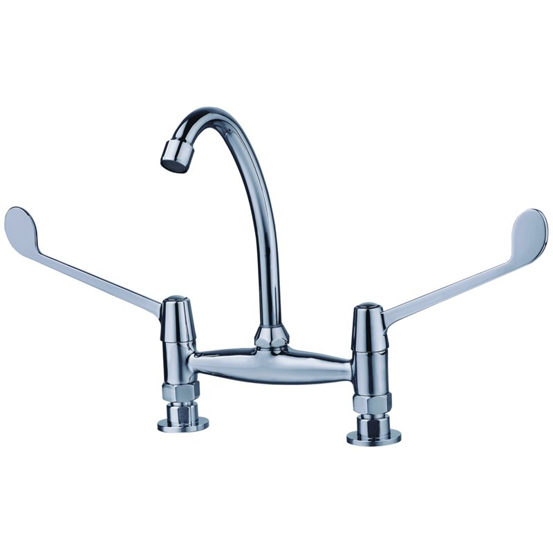 The Stalwart BXF206 Twin-Lever Sink Mixer Tap is a heavy-duty, commercial-grade tap designed for professional kitchens, bars, cafés, and food-prep environments. Featuring a robust deck-mounted twin-pillar design with two extended elbow-operated levers, it enables hygienic, hands-free operation, ideal for settings where cleanliness is essential.