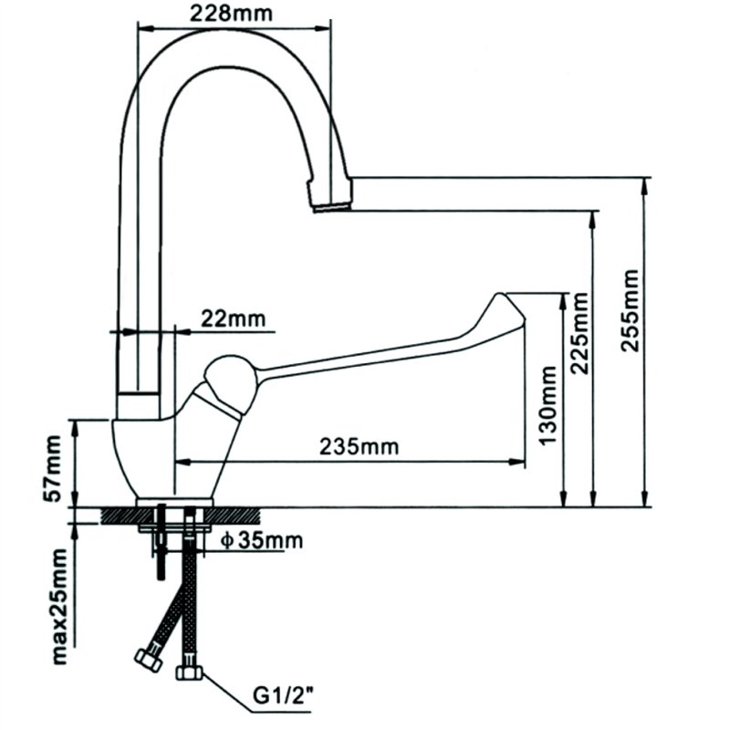 With a tall 255 mm spout height and 228 mm reach, this tap provides ample clearance for filling large pots, washing utensils, and handling bulky containers. Its extended single-lever handle enables easy elbow or forearm operation, helping maintain hygiene when hands are occupied or contaminated.