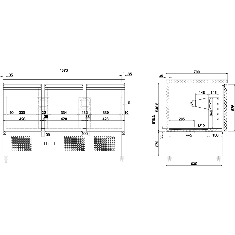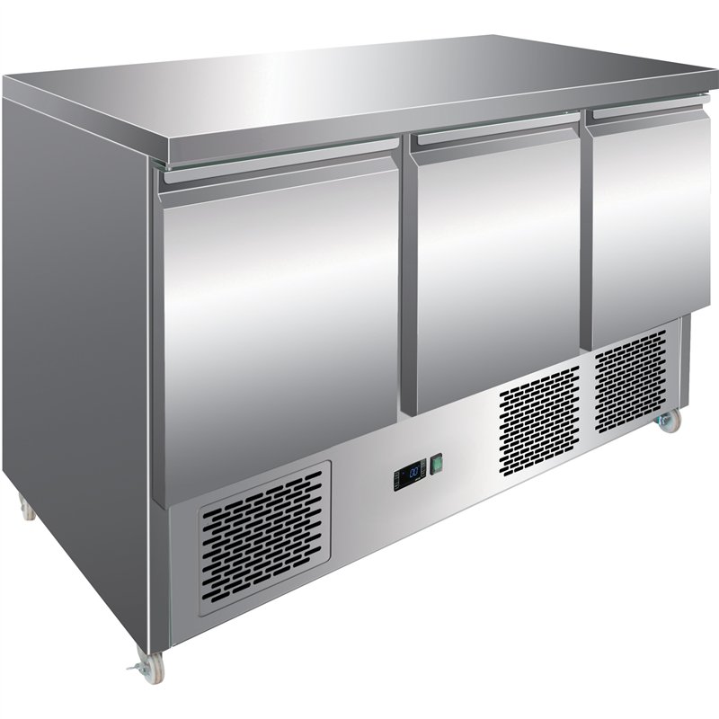 This commercial saladette/refrigerated counter is designed for professional kitchens, catering establishments, and foodservice operations requiring reliable chilled storage combined with a practical work surface. Featuring a stainless steel table top and three solid stainless steel doors, it offers durability, hygiene, and ease of use.