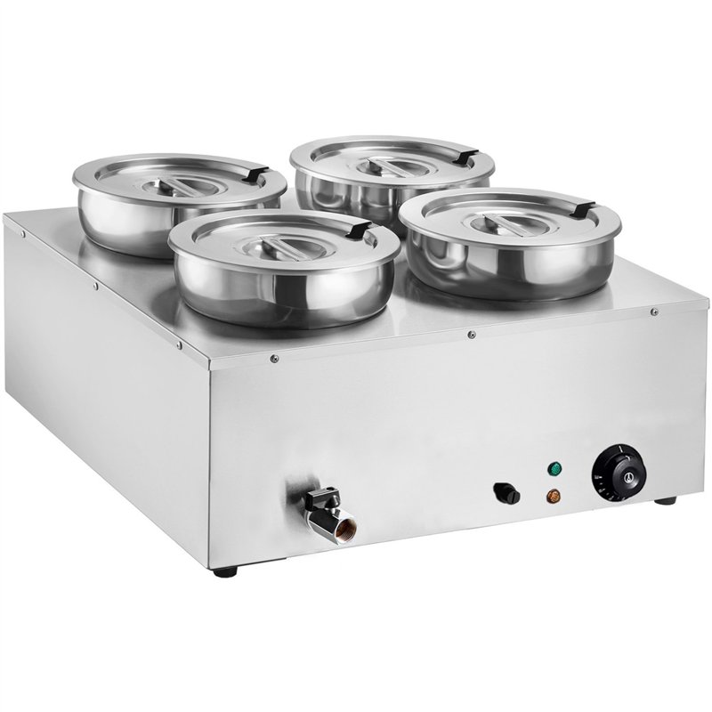 Equipped with four 7-litre round stainless steel pots, each with a 170 mm inner diameter and matching lids, the M847 allows you to warm multiple dishes simultaneously without burning. Its precise temperature control, built-in water drainage faucet, and durable stainless-steel construction ensure reliable performance in all commercial food-service environments.